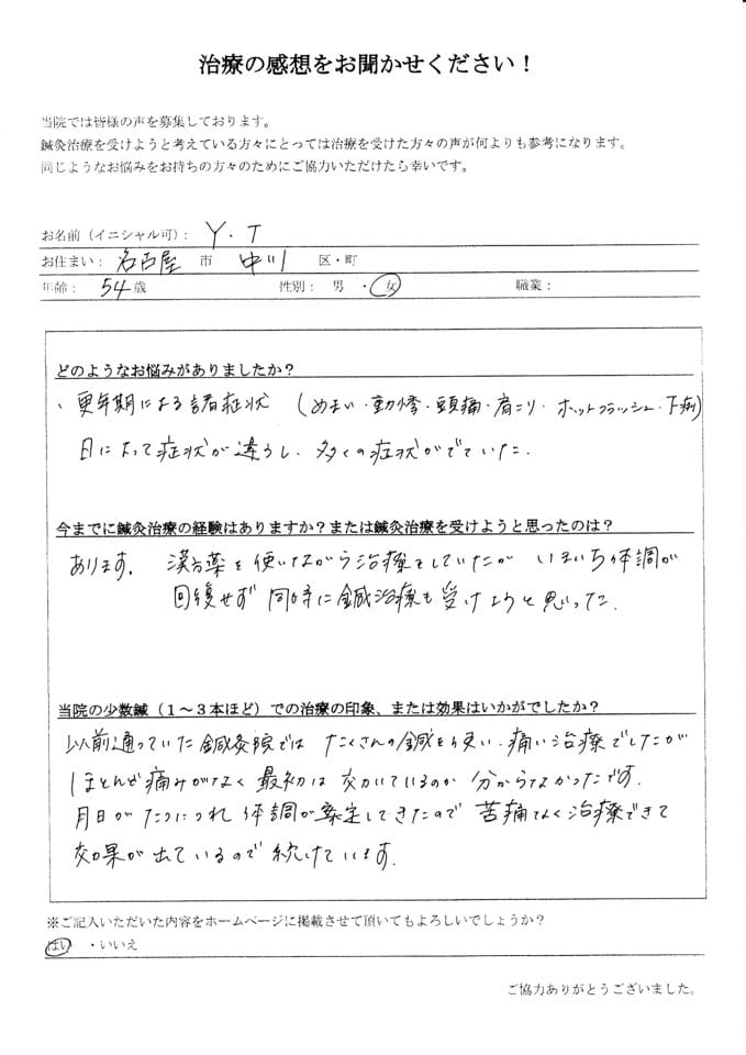 更年期障害特有の様々な症状でお悩みがあり、今までに漢方薬や他院での鍼灸治療を受けていましたが、なかなか改善しないということで当院へお越しになられました。